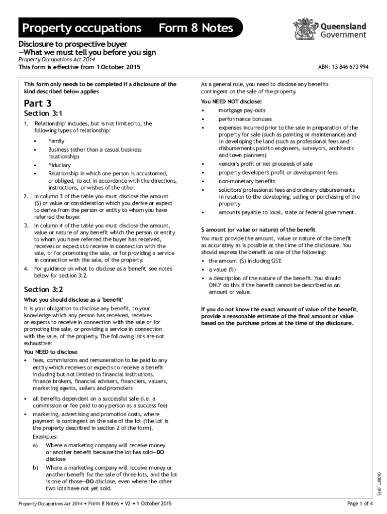 This form provides essential disclosures that must be made to prospective buyers as per the Property Occupations Act 2014. It includes details about relationships, benefits, and obligations related to the sale of property, as well as agent and property details crucial for a transparent real estate transaction.