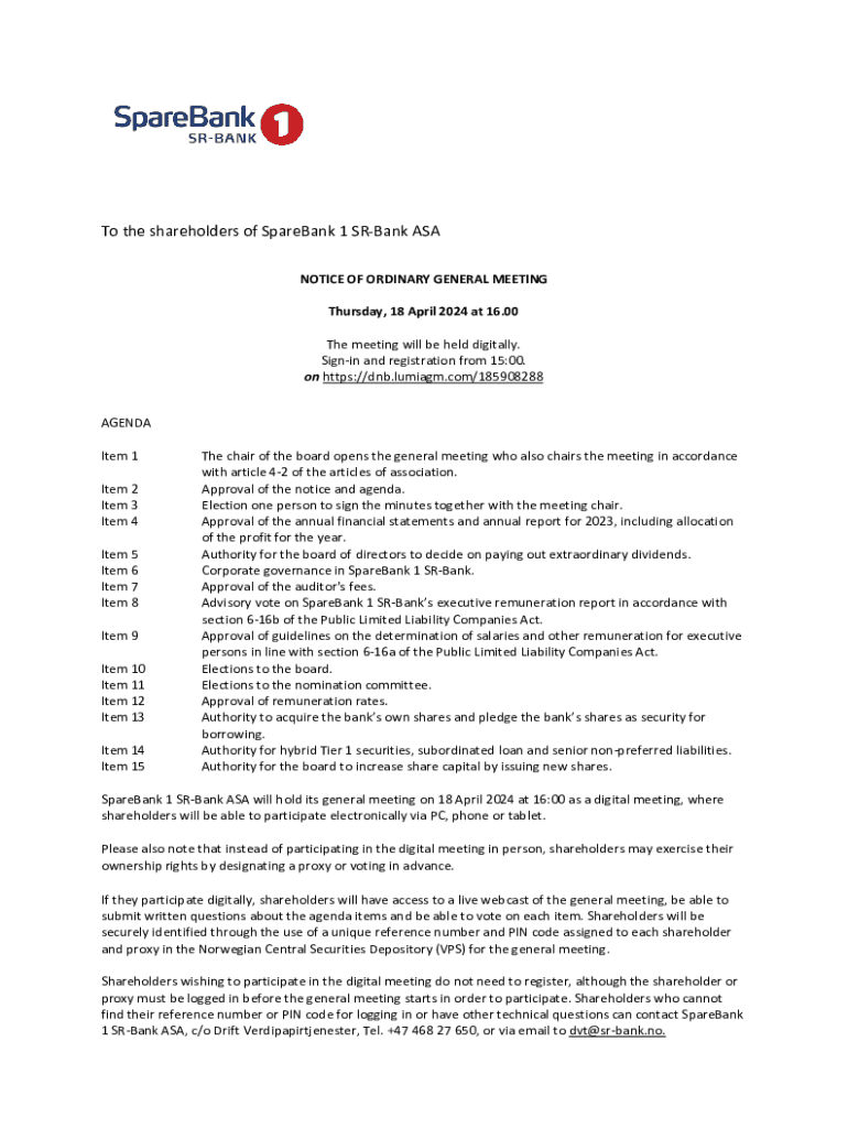 This document provides information regarding the ordinary general meeting of SpareBank 1 SR-Bank ASA scheduled for 18 April 2024, including agenda items, procedures for digital participation, and details on voting and proxy arrangements.