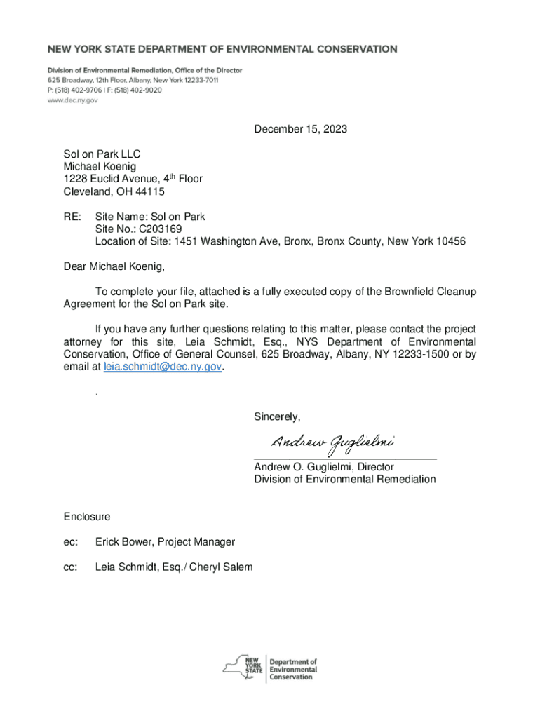 December 15, 2023 Sol on Park LLC Michael Koenig 1228 Euclid Avenue, 4th Floor Cleveland, OH 44115 RE:Site Name: Sol on Park Site No.: C203169 Location of Site: 1451 Washington Ave, Bronx, Bronx County,