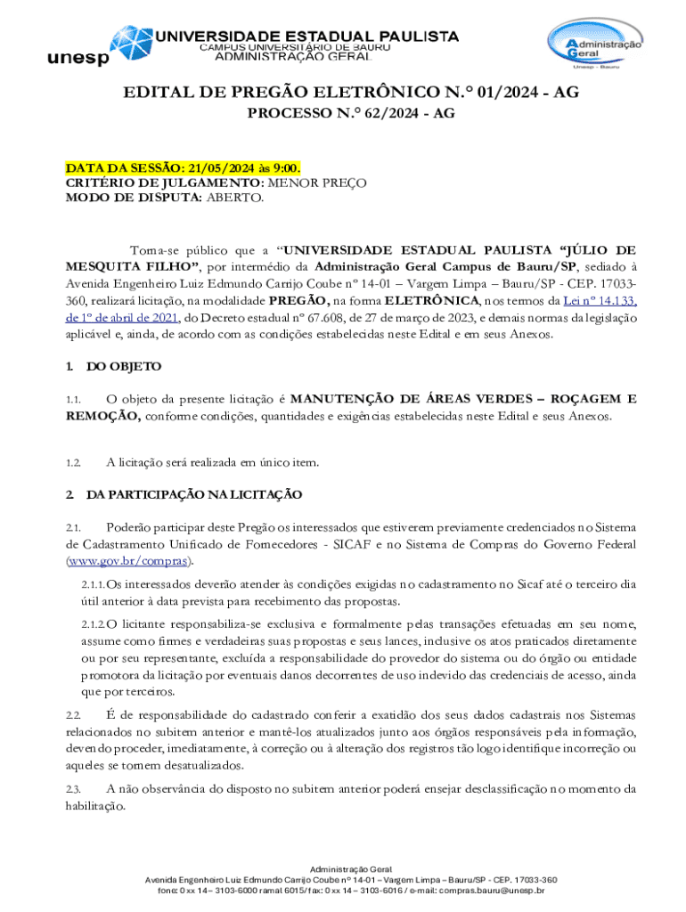 Obtenha o gratuito Edital De PregÃo EletrÔnico N.° 01/2024 - Ag