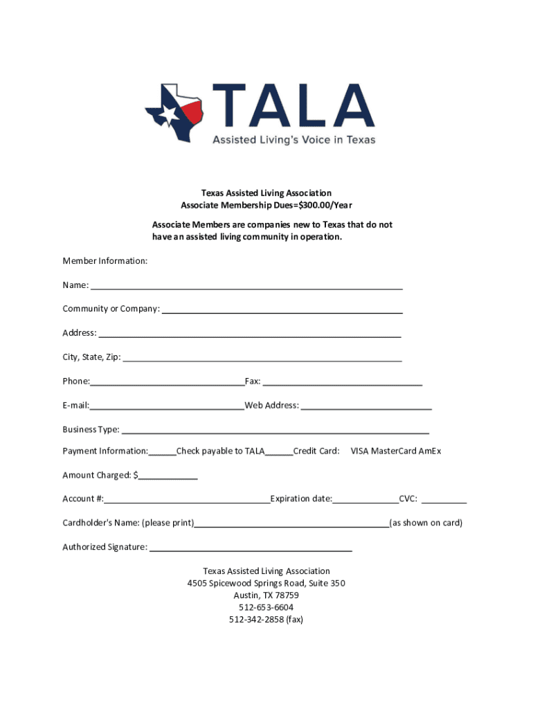 This form is to apply for associate membership with the Texas Assisted Living Association for companies new to Texas that do not have an assisted living community in operation.
