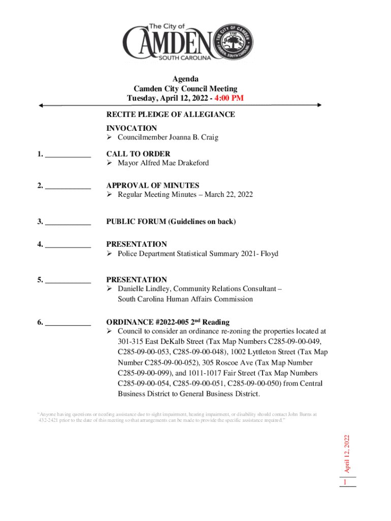 Agenda Camden City Council Meeting Tuesday, April 12, 2022 4:00 PM RECITE PLEDGE OF ALLEGIANCE INVOCATION Councilmember Joanna B. Craig 1. ___CALL TO ORDER Mayor Alfred Mae Drakeford2. ___APPROVAL OF MINUTES Regular Meeting Minutes March 22, 20223. ___PUBLIC FORUM (Guidelines on back)4. ___PRESENTATION Police Department Statistical Summary 2021 Floyd5. ___PRESENTATION Danielle Lindley, Community Relations Consultant South Carolina Human Affairs Commission6
