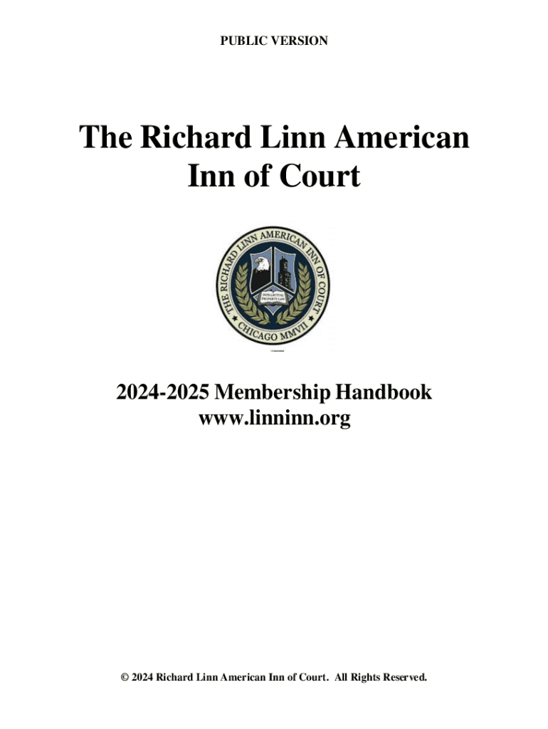 This handbook provides information regarding the membership, responsibilities, and events of the Richard Linn American Inn of Court for the 2024-2025 term. It includes details on meetings, mentoring programs, scholarship opportunities, and the commitment to professionalism and diversity within the field of intellectual property law.