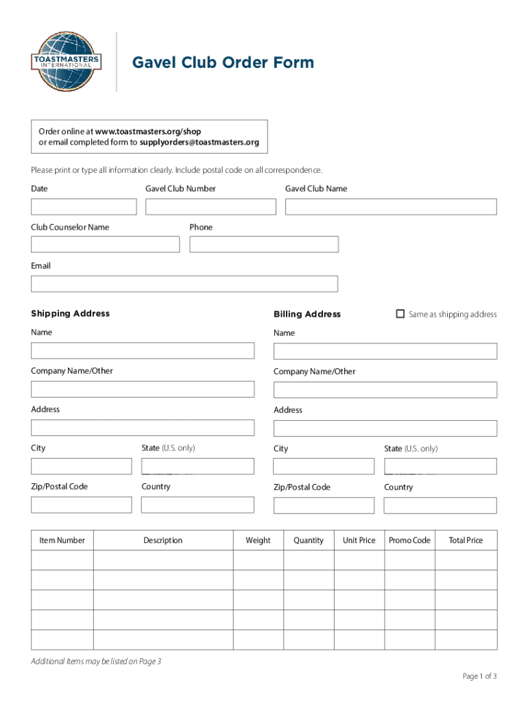 The gavel club order form is a document used by members of a gavel club to request materials, resources, or supplies necessary for club activities and events.