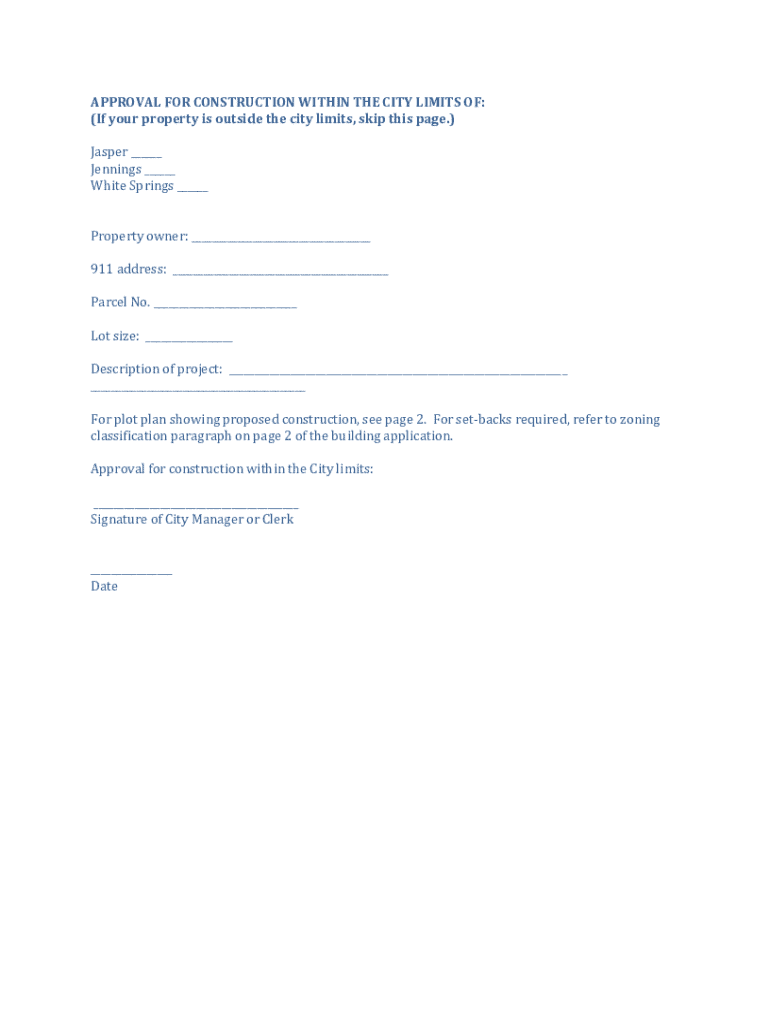 APPROVAL FOR CONSTRUCTION WITHIN THE CITY LIMITS OF: (If your property is outside the city limits, skip this page.) Jasper ___ Jennings ___ White Springs ___Property owner: ___ 911 address: ___ Parcel No. ___ Lot size: ___ Description of project: ___ ___ For plot plan showing proposed construction, see page 2. For setbacks required, refer to zoning classification paragraph on page 2 of the building application. Approval for construction within the City limits: ___ Signature of City Manager or
