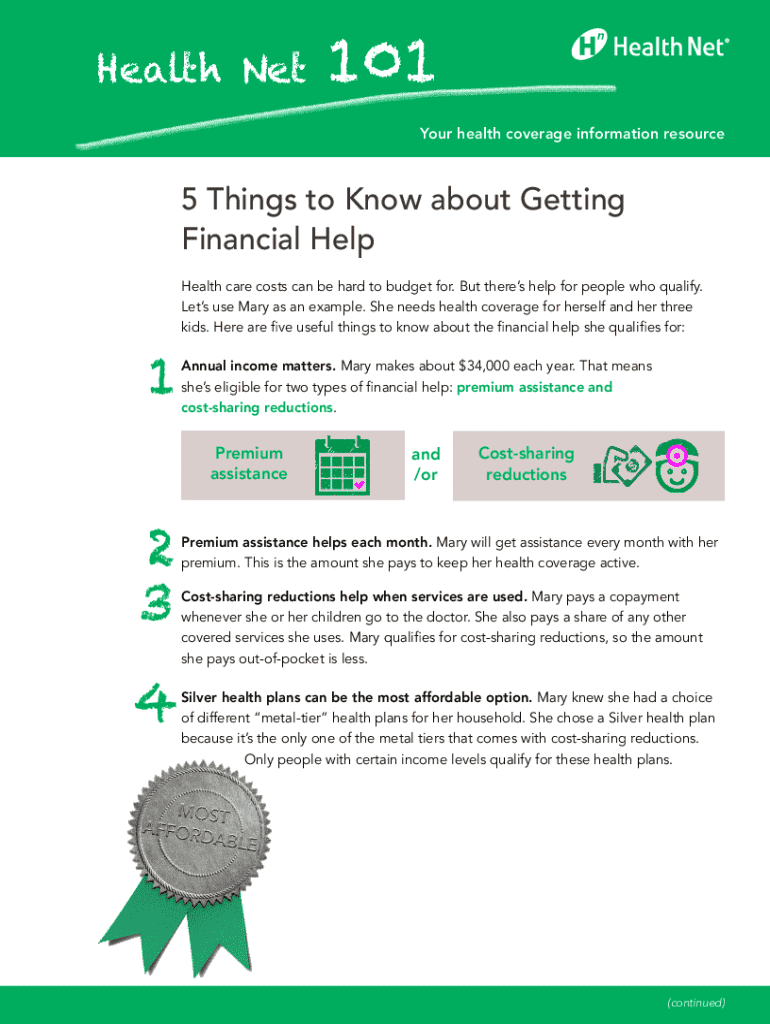 Your health coverage information resource5 Things to Know about Getting Financial Help1Health care costs can be hard to budget for. But theres help for people who qualify. Lets use Mary as an example. She needs health coverage for herself and her three kids. Here are five useful things to know about the financial help she qualifies for: Annual income matters. Mary makes about $34,000 each year. That means shes eligible for two types of financial help: premium assistance and costsharing...