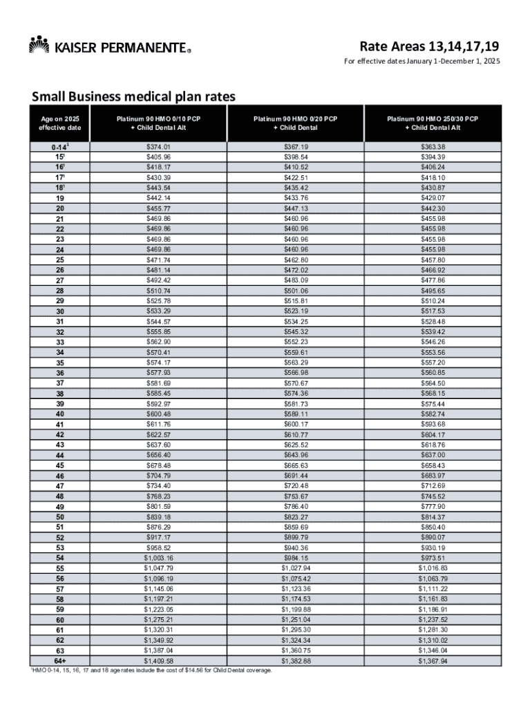 Rate Areas 13,14,17,19 For effective dates January 1December 1, 2025Small Business medical plan rates Age on 2025 effective date 1014 15 16 17 18 19 20 21 22 23 24 25 26 27 28 29 30 31 32 33 34 35 36 37 38 39 40 41 42 43 44 45 46 47 48 49 50 51 52 53 54 55 56 57 58 59 60 61 62 63 64+Platinum 90 HMO 0/10 PCP + Child Dental AltPlatinum 90 HMO 0/20 PCP + Child DentalPlatinum 90 HMO 250/30 PCP + Child Dental Alt$374.01$367.19$363.38$405.96$398.54$394.39$418.17$410