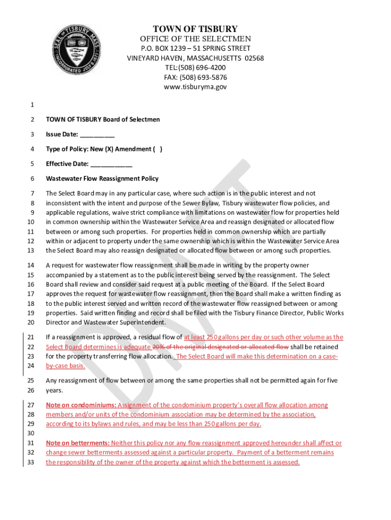 This policy outlines the procedures for the reassignment of wastewater flow for properties held in common ownership within Tisbury\'s Wastewater Service Area, including the necessary requests, approvals, and conditions related to such reassignments.