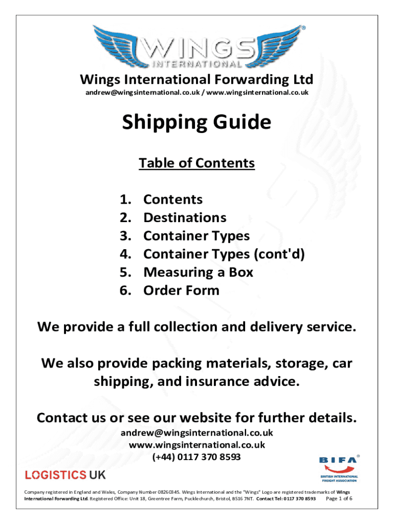 Comprehensive guide detailing shipping services, container types, and order form for shipments with Wings International Forwarding Ltd.