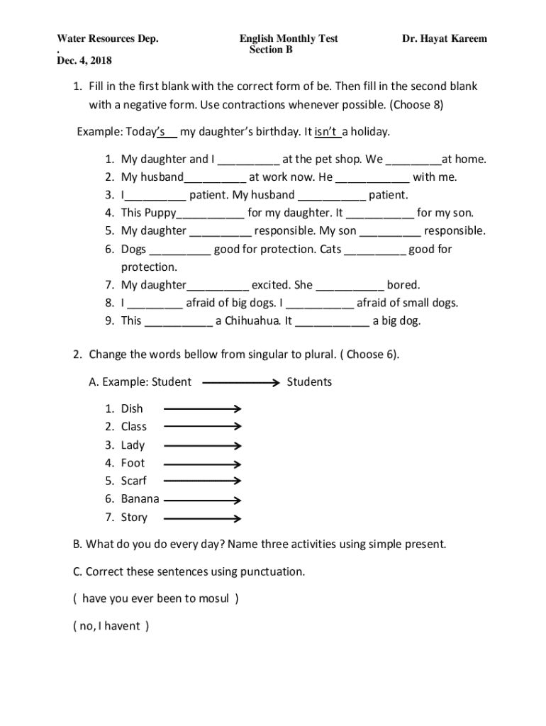 This document is a monthly English test designed for evaluating students\' understanding of grammatical structures, including the correct use of the verb \'to be\', pluralization of nouns, and simple present tense. It includes fill-in-the-blank exercises, sentence correction, and common daily activities.