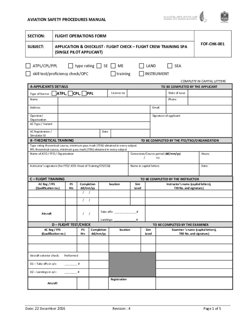 Este formulario se aplica a la capacitación de la tripulación de vuelo para PPL/CPL / tipo de licencia / capacitación / prueba de habilidad y verificación de competencia en aeronaves de piloto único y multimotor, también puede ser utilizado para una verificación de competencia del operador.
