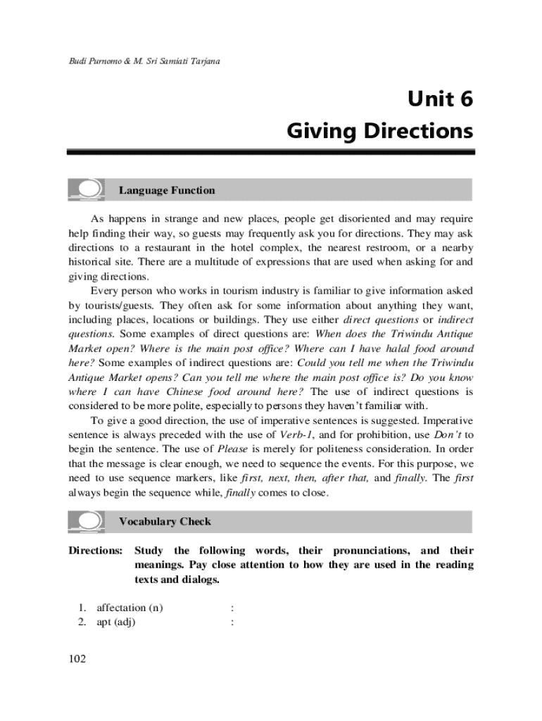 Budi Purnomo & M. Sri Samiati TarjanaUnit 6 Giving Directions Language Function As happens in strange and new places, people get disoriented and may require help finding their way, so guests may frequently