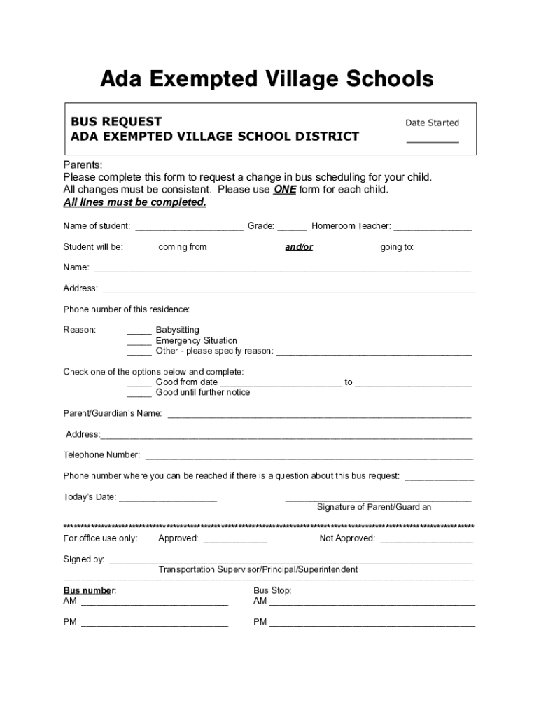 This form is to be completed by parents to request a change in bus scheduling for their child. Each child requires a separate form, and all lines must be completed.