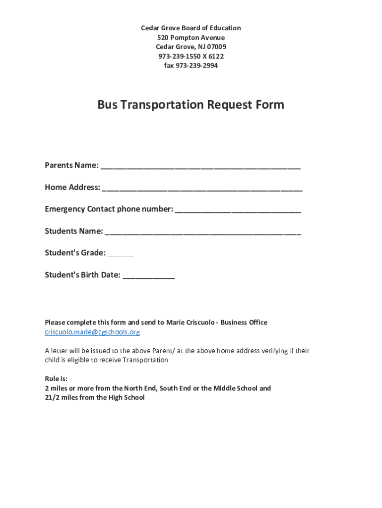 This form is used by parents to request bus transportation for their children attending Cedar Grove School. It collects essential information such as parent\'s name, home address, emergency contact number, student\'s name, grade, and birth date. Upon completion, it should be sent to the Business Office for processing.