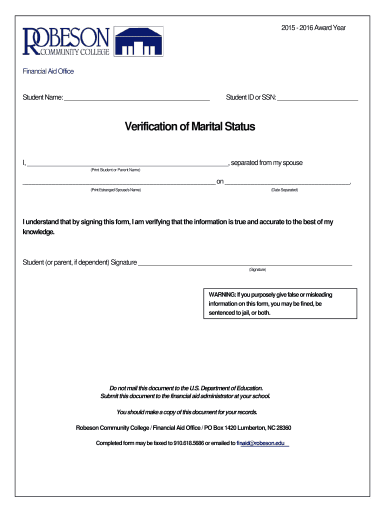2015 – 2016 Award Year Financial Aid Office Student Name: Student ID or SSN: Verification of Marital Status I, separated from my spouse (Print Student or Parent Name) on. (Print Estranged Spouse's