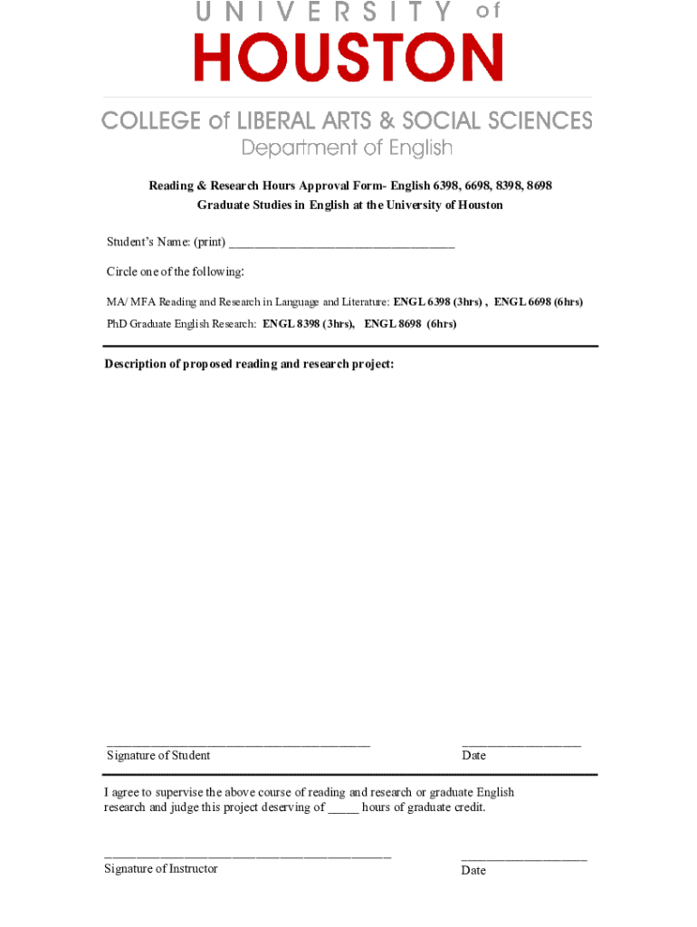 This form is used to approve reading and research hours for graduate students in English at the University of Houston, allowing them to outline their proposed project and receive necessary supervisory signatures.