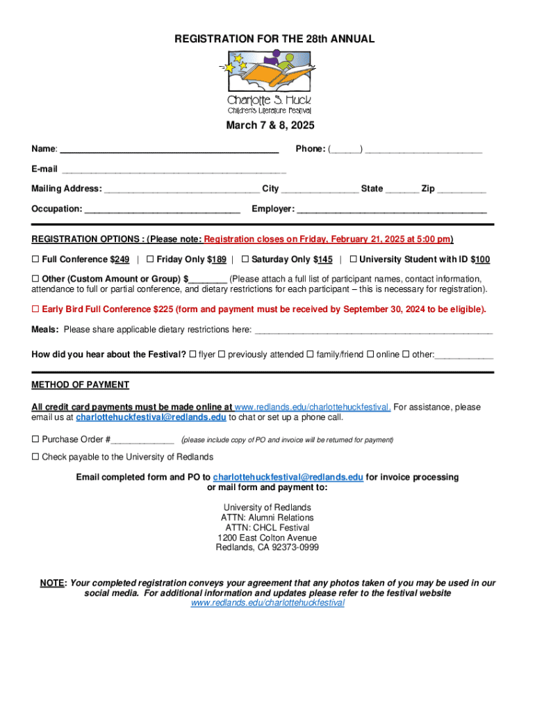 This document serves as a registration form for the 28th Annual Festival scheduled for March 7 & 8, 2025. It includes options for registration fees, personal information fields, dietary restriction inquiries, and payment method details.