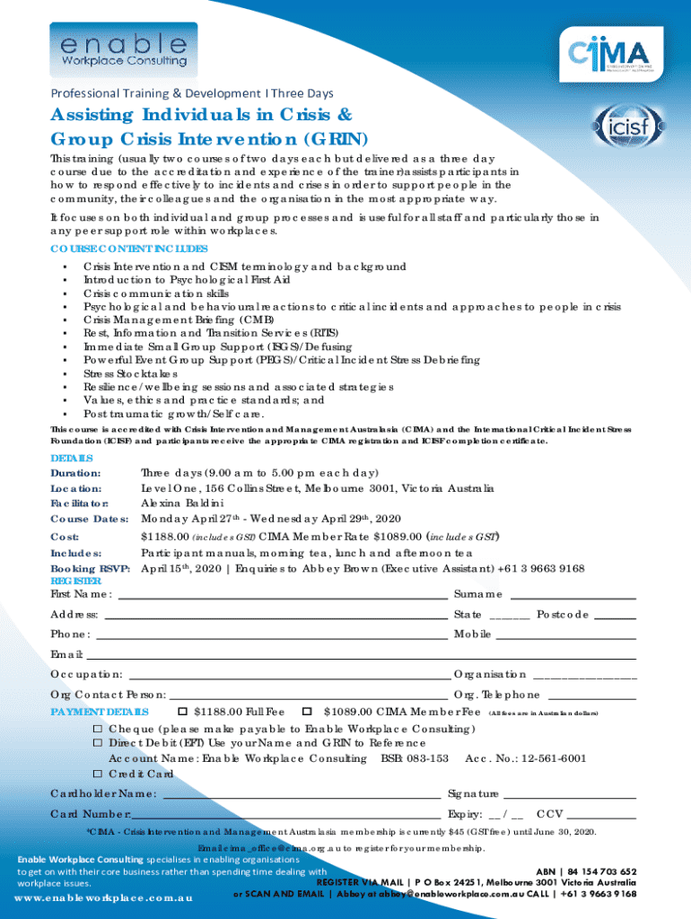 Professional Training & Development I Three DaysAssisting Individuals in Crisis & Group Crisis Intervention (GRIN)This training (usually two courses of two days each but delivered as a three day course due to the accreditation and experience of the trainer)assists participants in how to respond effectively to incidents and crises in order to support people in the community, their colleagues and the organisation in the most appropriate way. It focuses on both individual and group processes and