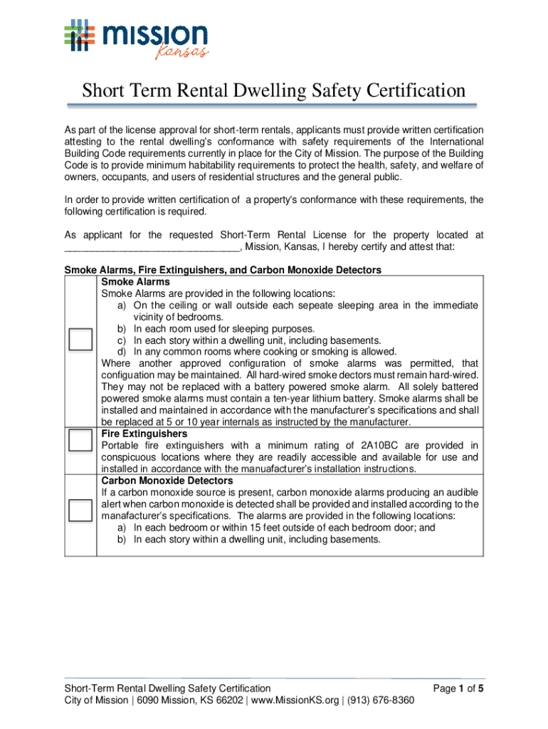 Este documento es parte del proceso de aprobación de licencia para alquileres a corto plazo, donde los solicitantes deben proporcionar una certificación escrita que atestigüe la conformidad de la vivienda de alquiler con los requisitos de seguridad del Código Internacional de Construcción en la Ciudad de Mission.