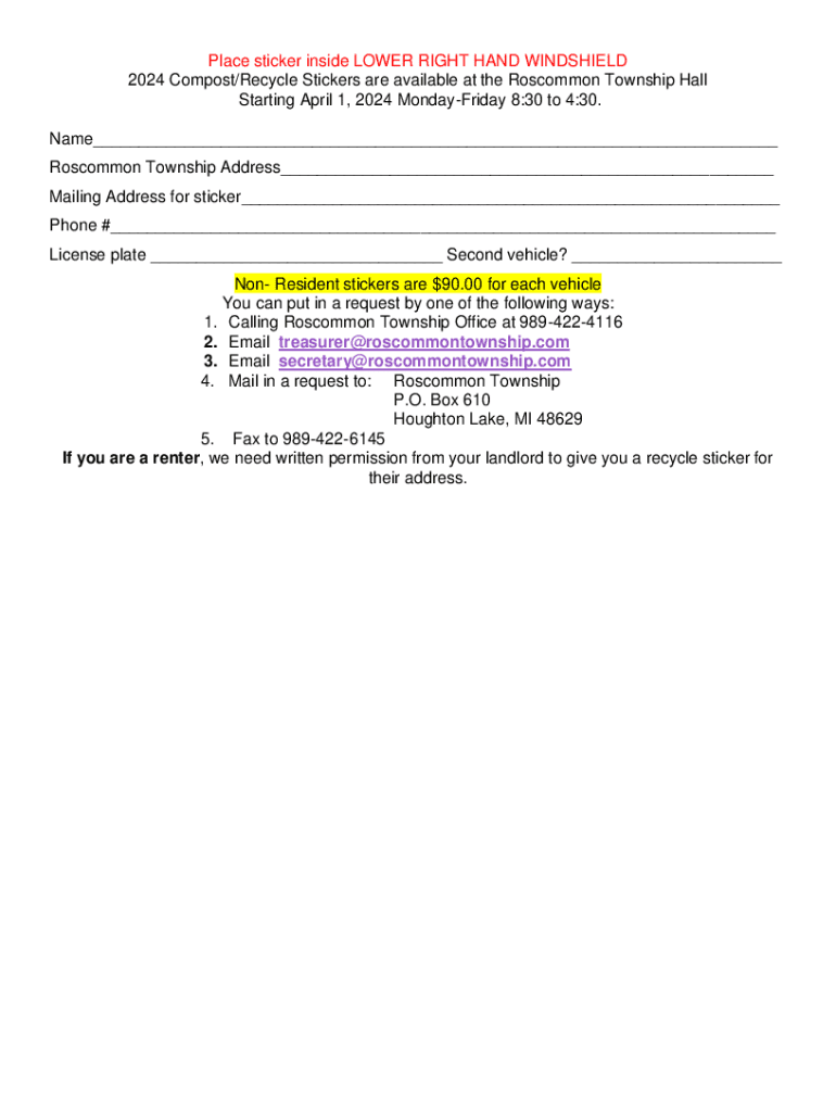 Place sticker inside LOWER RIGHT HAND WINDSHIELD 2024 Compost/Recycle Stickers are available at the Roscommon Township Hall Starting April 1, 2024 MondayFriday 8:30 to 4:30. Name___ Roscommon Township Address___ Mailing Address for sticker___ Phone #___ License plate ___ Second vehicle? ___ Non Resident stickers are $90.00 for each vehicle You can put in a request by one of the following ways: 1. Calling Roscommon Township Office at 9894224116 2. Email treasurer@roscommontownship.com 3. Email...