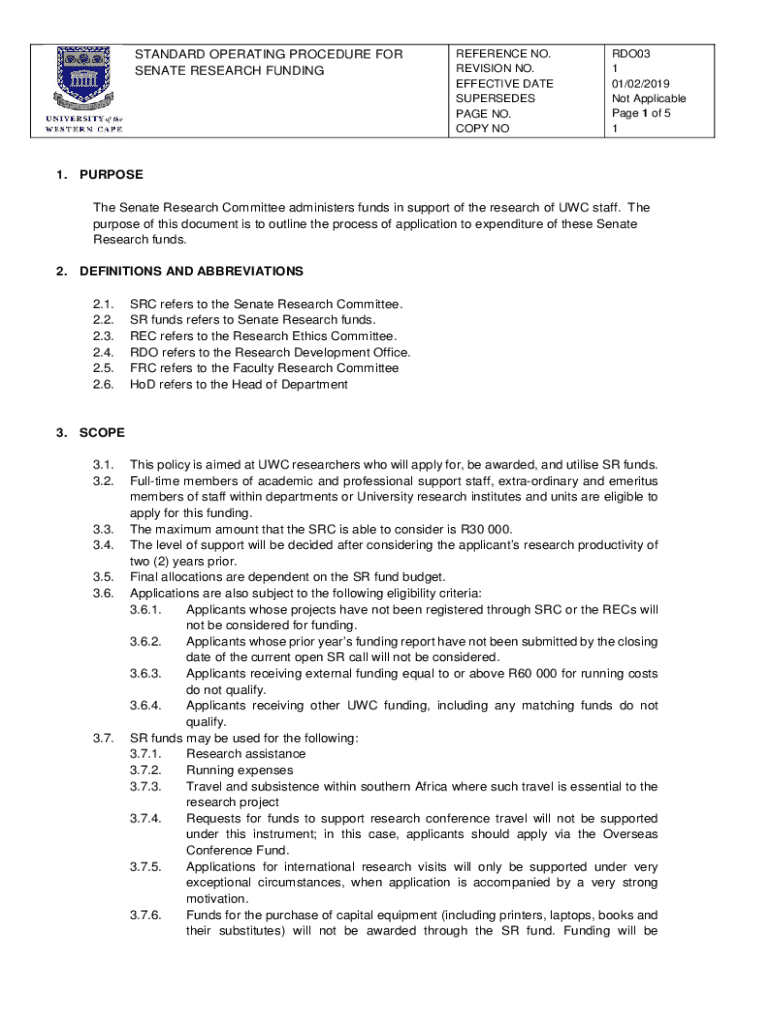 This document outlines the application process and expenditure policies regarding the Senate Research funds available to UWC staff for research purposes. It details eligibility criteria, limitations on amounts, and requirements for application and reporting.