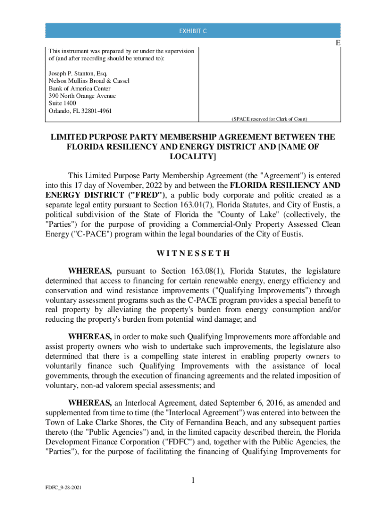 EXHIBIT CE This instrument was prepared by or under the supervision of (and after recording should be returned to): Joseph P. Stanton, Esq. Nelson Mullins Broad & Cassel Bank of America Center 390 North Orange Avenue Suite 1400 Orlando, FL 328014961 (SPACE reserved for Clerk of Court)LIMITED PURPOSE PARTY MEMBERSHIP AGREEMENT BETWEEN THE FLORIDA RESILIENCY AND ENERGY DISTRICT AND [NAME OF LOCALITY] This Limited Purpose Party Membership Agreement (the \"Agreement\") is entered into this 17 day