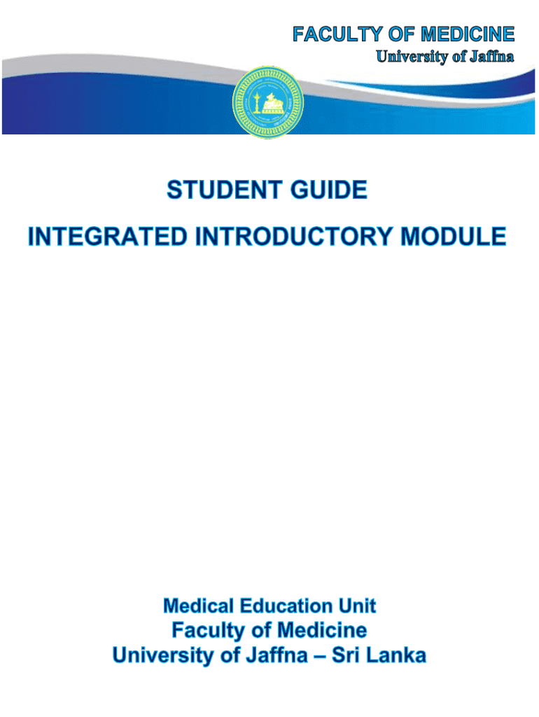 Preface This student guide is prepared to facilitate students to go through the first few weeks of life in the medical faculty smoothly. The Integrated introductory module is designed in such a way to make students adapt to the learning environment of a university. This includes a few tips on adult learning, learning styles, selflearning, how to adapt to the university life, the code of conduct for students and the outline of the programme. This is an integrated module where introduction...