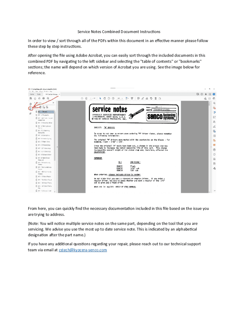 Service Notes Combined Document Instrucons In order to view / sort through all of the PDFs within this document in an eecve manner please follow these step by step instrucons. Aer opening the le using Adobe Acrobat, you can easily sort through the included documents in this combined PDF by navigang to the le sidebar and selecng the \"table of contents\" or \"bookmarks\" secons; the name will depend on which version of Acrobat you are using. See the image below for reference