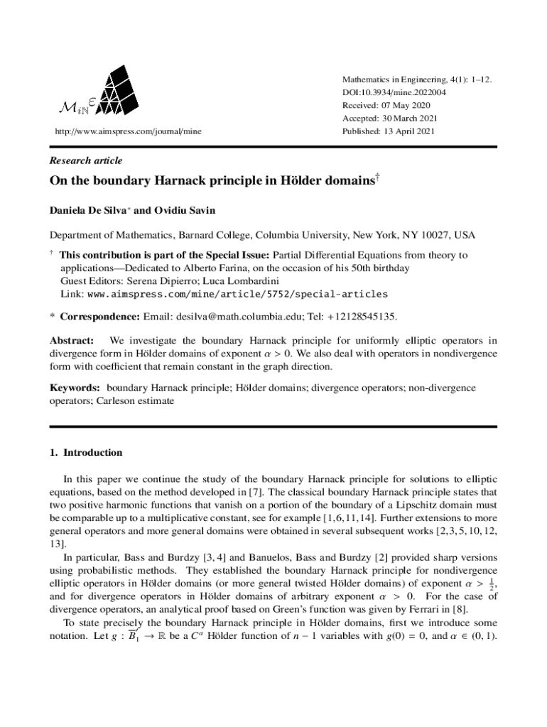 Mathematics in Engineering, 4(1): 112. DOI:10.3934/mine.2022004 Received: 07 May 2020 Accepted: 30 March 2021 http://www.aimspress.com/journal/minePublished: 13 April 2021Research articleOn the boundary Harnack principle in Holder domains Daniela De Silva and Ovidiu Savin Department of Mathematics, Barnard College, Columbia University, New York, NY 10027, USA This contribution is part of the Special Issue: Partial Differential Equations from theory to applicationsDedicated