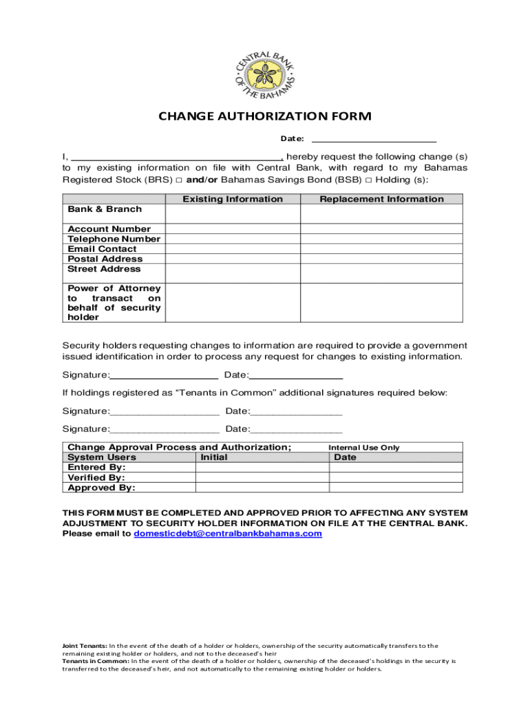 This form allows security holders to request changes to their existing information on file with the Central Bank regarding Bahamas Registered Stock and/or Bahamas Savings Bond holdings. It requires