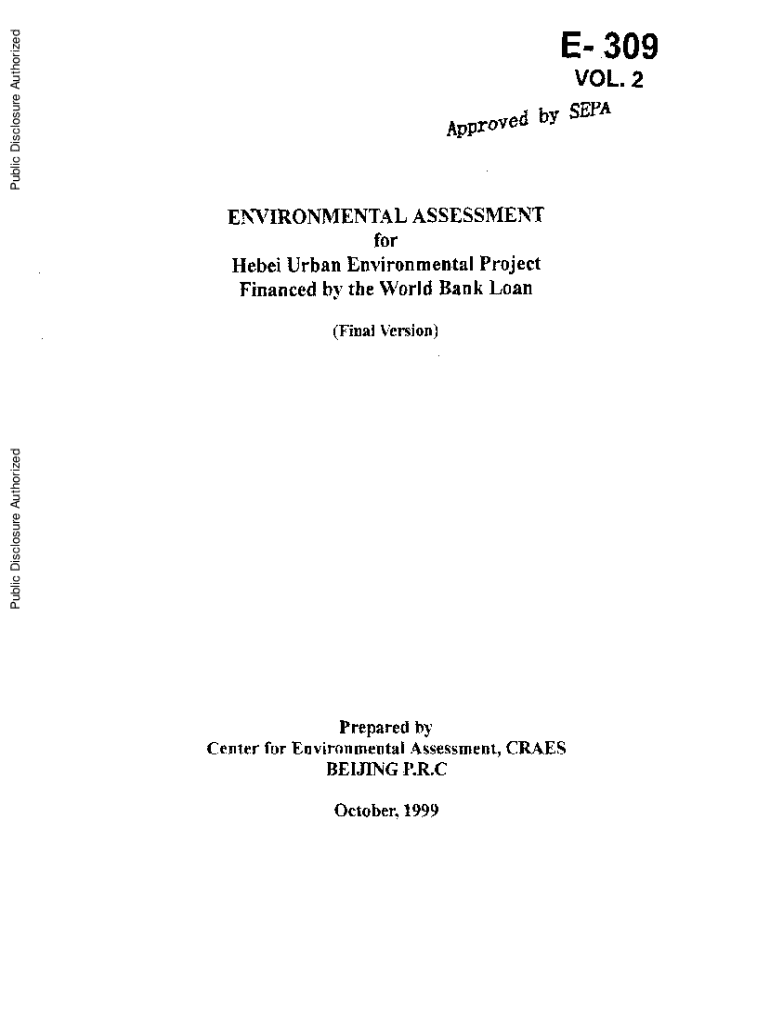 Public Disclosure AuthorizedVOL. 2 Approved by SEPAENVIRONMENTALASSESSMENT for Hebei Urban Environmental Project Financed by the World Bank Loan (Final Version)Public Disclosure AuthorizedPublic Disclosure AuthorizedPublic Disclosure AuthorizedE 309Prepared by Center for Environmental Assessment, CRAES BEIJING P.R.C October, 1999tEnvironmental Assessniewit for Hebei tUrban Environmental Pro.ject Financed bv the World BankiLoanCenier for Environmental Assessmentel.CR4ES License: Class A, No