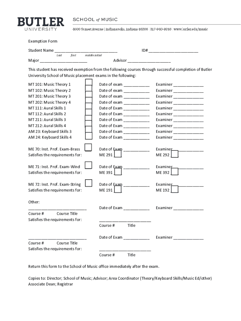 This form is used by students at Butler University School of Music to document exemptions from specific music theory and skills courses based on successful completion of placement exams.