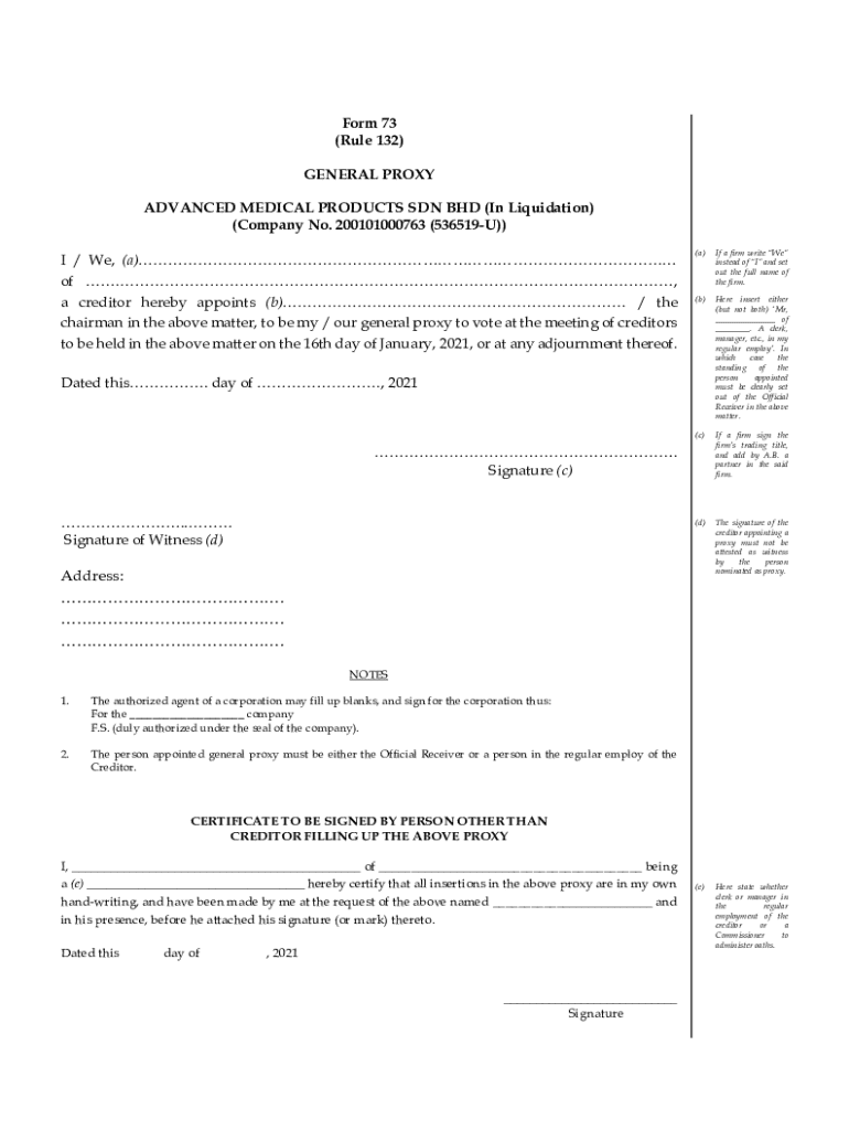 This document serves as a general proxy for creditors of Advanced Medical Products Sdn Bhd (In Liquidation), allowing them to appoint a person to vote on their behalf at the meeting of creditors on
