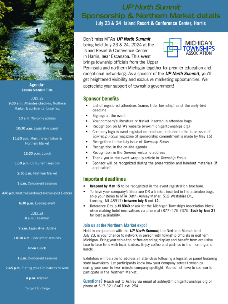 Información sobre oportunidades de patrocinio y el mercado del norte en la cumbre de UP North, incluyendo agenda, beneficios para patrocinadores y detalles de registro.