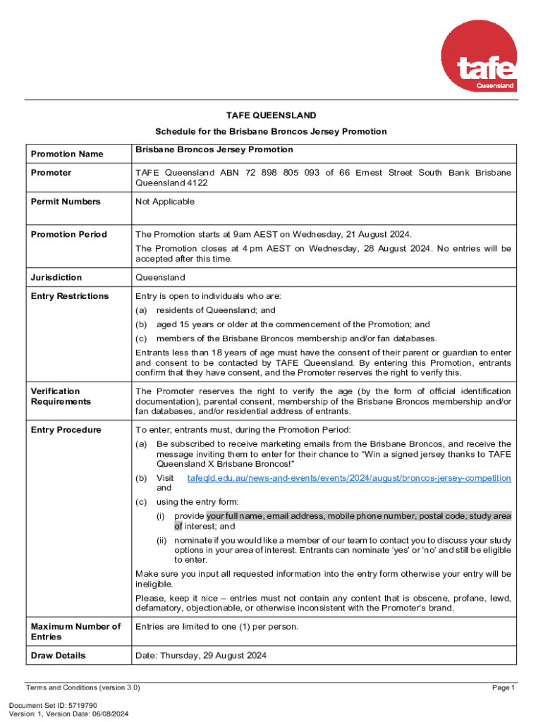 This document provides details regarding the Brisbane Broncos Jersey Promotion conducted by TAFE Queensland, including entry requirements, timelines, prize details, and terms and conditions.