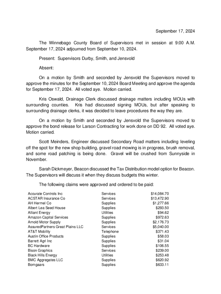 September 17, 2024 The Winnebago County Board of Supervisors met in session at 9:00 A.M. September 17, 2024 adjourned from September 10, 2024. Present: Supervisors Durby, Smith, and Jensvold Absent: On a motion by Smith and seconded by Jensvold the Supervisors moved to approve the minutes for the September 10, 2024 Board Meeting and approve the agenda for September 17, 2024. All voted aye. Motion carried. Kris Oswald, Drainage Clerk discussed drainage matters including MOUs with surrounding...
