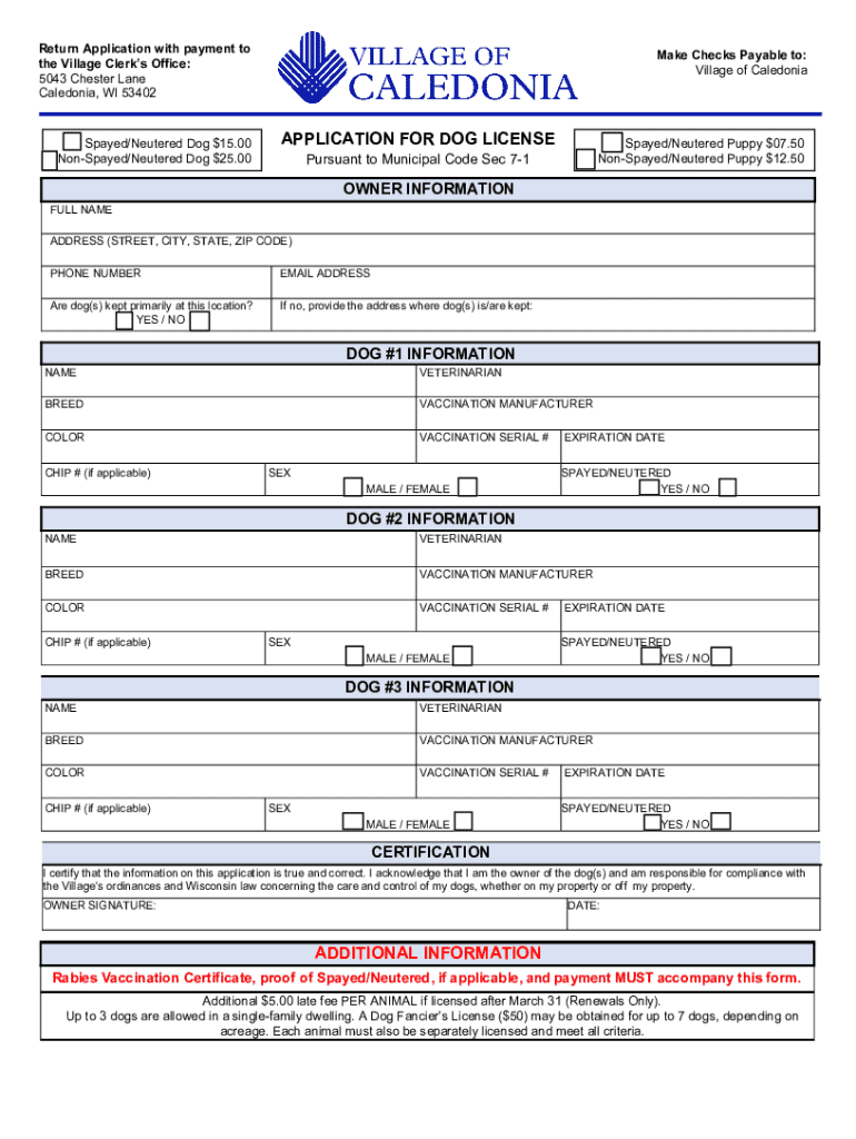 This form is used to apply for a dog license in the Village of Caledonia. It includes sections for owner information, details about the dog(s) including breed, vaccination status, and the necessary