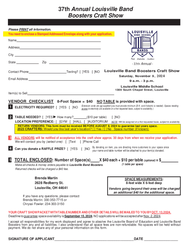 37th Annual Louisville Band Boosters Craft Show Please PRINT all information. Name Address City StateZipContact Phone 37th Annual Texting? [ ]YES [ ]NOEmail AddressLouisville Band Boosters Craft Show Saturday, November 9 , 2024 9 a.m. 3 p.m.Louisville Middle School 1300 South Chapel Street, LouisvilleItem(s) to SellVENDOR CHECKLIST 8Foot Space $40 NO TABLE is provided with space. cords are not supplied (you must provide minimum 20ft. cord if electric is needed). Spaces needing 1