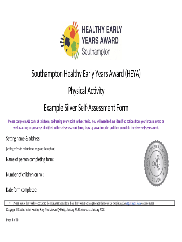 Southampton Healthy Early Years Award (heya) Silver Self-assessment template instructions