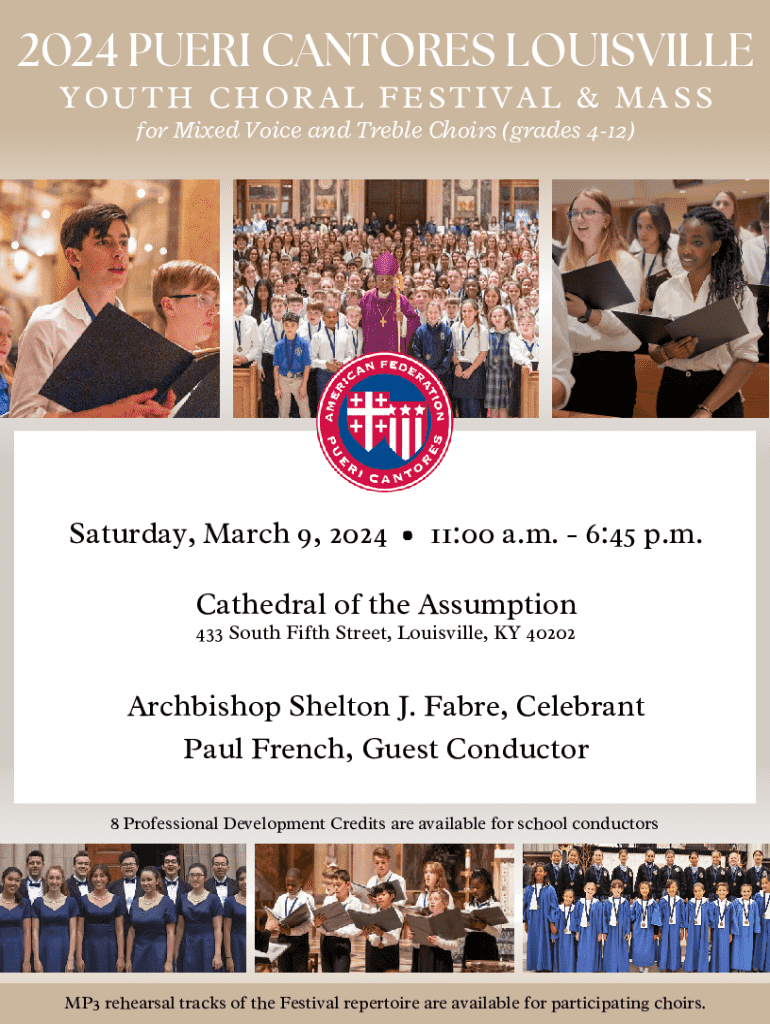 2024 PUERI CANTORES LOUISVILLE YOUTH CHORAL FESTIVAL & MASS for Mixed Voice and Treble Choirs (grades 412)Saturday, March 9, 202411:00 a.m. 6:45 p.m.Cathedral of the Assumption 433 South Fifth Street,