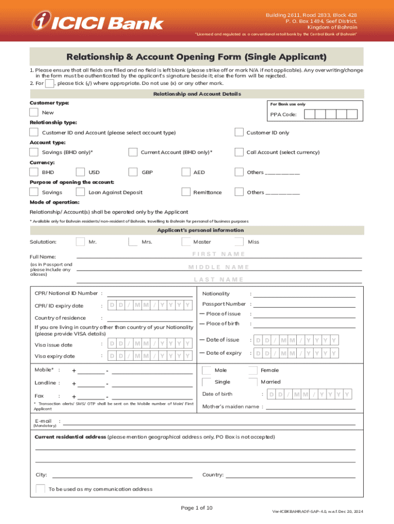 Este formulario está diseñado para que los solicitantes inicien una relación bancaria con ICICI Bank en Bahréin, incluyendo la apertura de cuentas y la recopilación de información personal necesaria para cumplir con las regulaciones bancarias y de KYC.