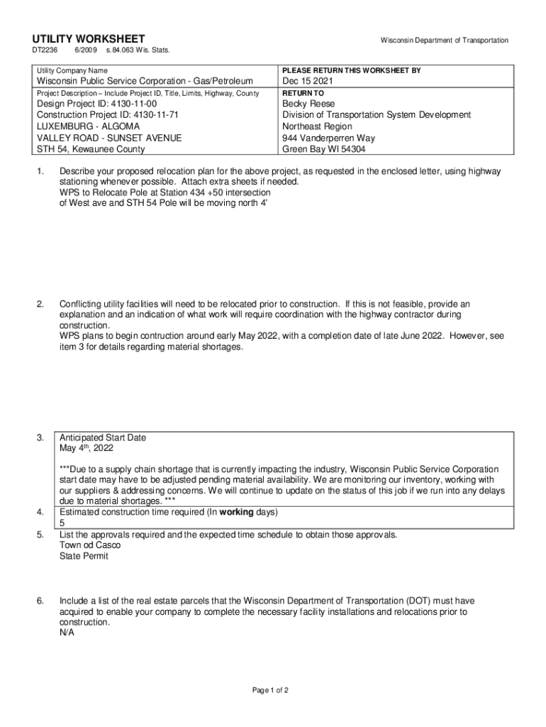 This worksheet is used by the Wisconsin Department of Transportation for utility companies to detail their proposed relocation plans and conflicts with ongoing construction projects. It includes project