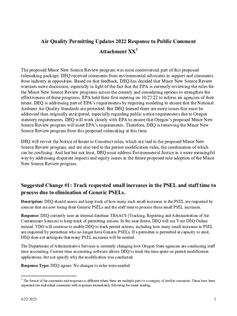 Air Quality Permitting Updates 2022 Response to Public Comment Attachment XX1 The proposed Minor New Source Review program was most controversial part of this proposed rulemaking package. DEQ received comments from environmental advocates in support and comments from industry in opposition. Based on that feedback, DEQ has decided that Minor New Source Review warrants more discussion, especially in light of the fact that the EPA is currently reviewing the rules for the Minor New Source Review...