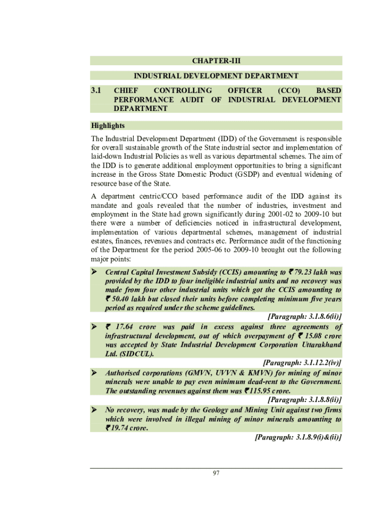 CHAPTERIII INDUSTRIAL DEVELOPMENT DEPARTMENT3.1CHIEF CONTROLLING OFFICER (CCO) BASED PERFORMANCE AUDIT OF INDUSTRIAL DEVELOPMENT DEPARTMENTHighlights The Industrial Development Department (IDD) of