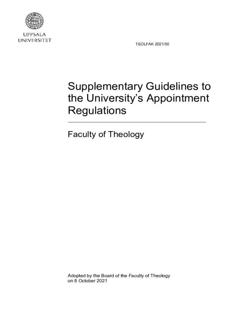 TEOLFAK 2021/50Supplementary Guidelines to the Universitys Appointment Regulations Faculty of TheologyAdopted by the Board of the Faculty of Theology on 8 October 2021UPPSALA UNIVERSITY Faculty of TheologySUPPLEMENTARY GUIDELINES TO THE UNIVERSITYS APPOINTMENT REGULATIONS 8 OCTOBER 2021TEOLFAK 2021/50Contents 1Introduction ___ 42Review of appointment and promotion cases ___ 43Eligibility and assessment criteria ___ 5 3.1General ___ 5 3.1.1 Research expertise ___ 6 3