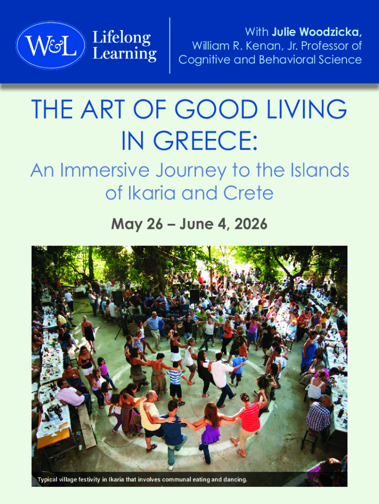 With Julie Woodzicka, William R. Kenan, Jr. Professor of Cognitive and Behavioral ScienceTHE ART OF GOOD LIVING IN GREECE: An Immersive Journey to the Islands of Ikaria and Crete May 26 June 4, 2026Typical village festivity in Ikaria that involves communal eating and dancing.TRAVELING WITH YOU JULIE WOODZICKA William R. Kenan, Jr. Professor of Cognitive and Behavioral Science Dear Washington & Lee Travelers, Undoubtedly, the Greek islands are one of the worlds most alluring places to visit