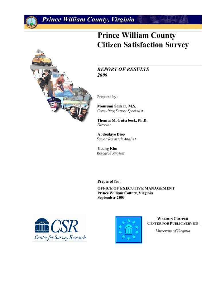 This report presents the results of the 2009 Citizen Satisfaction Survey conducted for Prince William County, Virginia. It assesses residents\' satisfaction with various county services, quality of life, communication with the government, and other community-related issues. The report provides insights into demographic trends and changes in resident satisfaction compared to previous years.