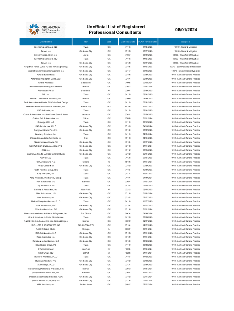 Unofficial List of Registered Professional Consultants06/01/2024Vendor NameCityStateZip/Postal CodePCON Renewal DateDisciplineEnvironmental Works, INCTulsaOK7411611/03/202310010 General MitigationTecAn,