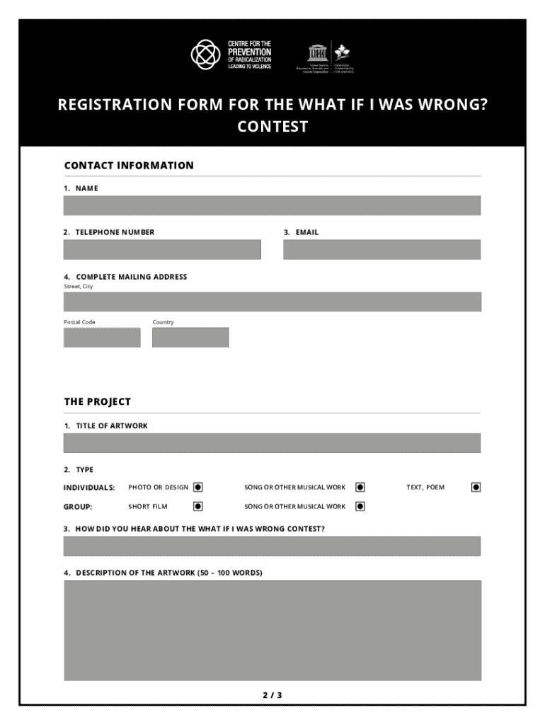A registration form for the What If I Was Wrong? contest, aimed at promoting skills like resilience and critical thinking through artwork submissions from young people aged 13 to 35. Participants can enter various formats including photos, designs, or short films related to themes of critical thinking and social awareness.