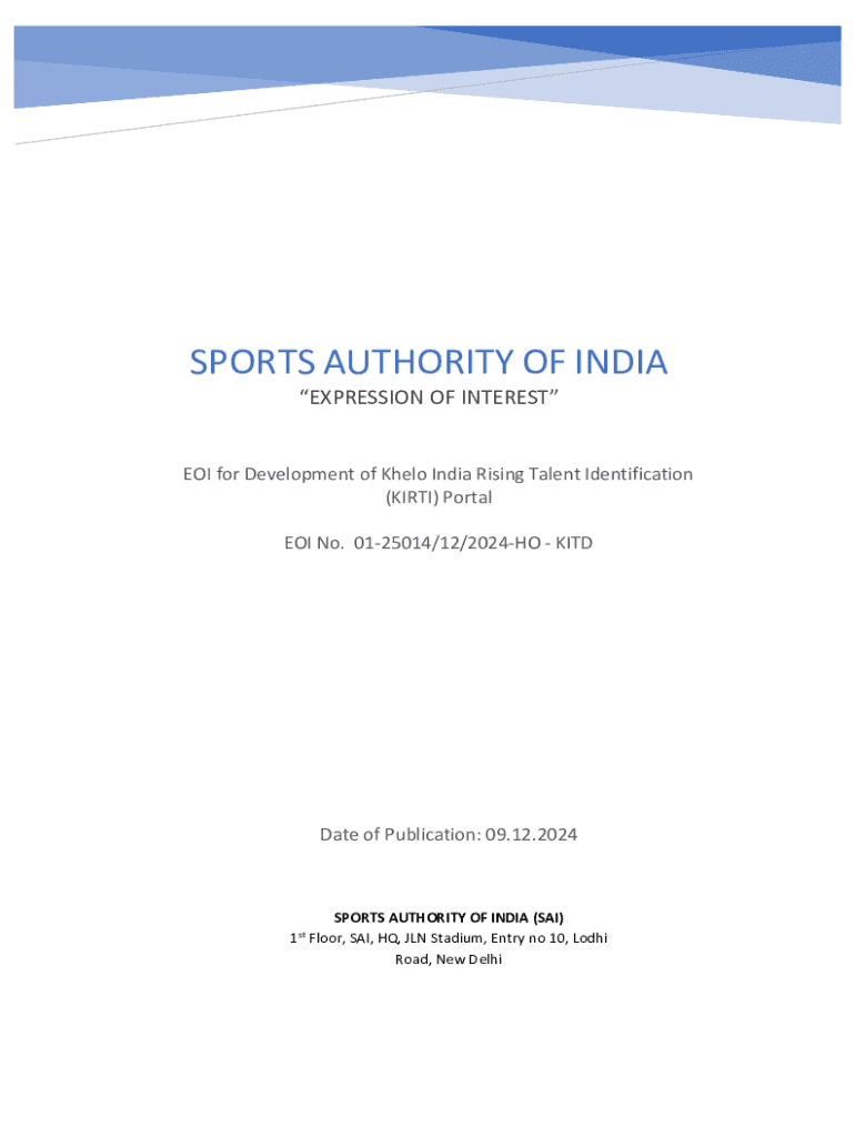This document serves as an Expression of Interest (EOI) for the development of the Khelo India Rising Talent Identification (KIRTI) Portal, issued by the Sports Authority of India. The EOI outlines